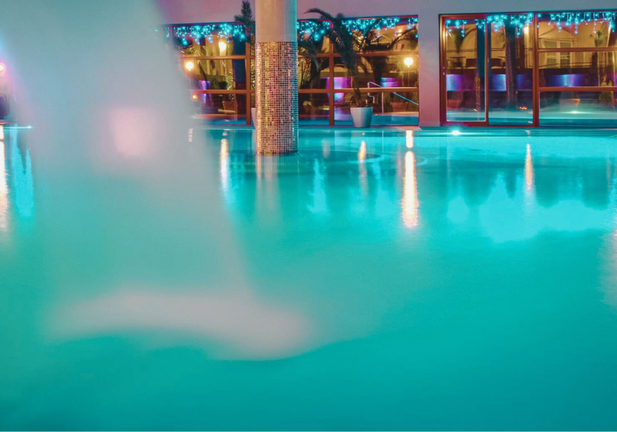 BAZÉNY S MINERÁLNOU VODOU: Naším najväčším bohatstvom je minerálna voda v našich bazénoch s teplotou 30-31°C. Vyviera priamo z útrob zeme a má blahodarné účinky na regeneráciu svalov a kĺbov a Vaše celkové zdravie. Dezinfekcia vody Duozónom bez chlóru je šetrná k Vašej pokožke. Celoročne je naším hosťom k dispozícii vnútorný relaxačný oddychový bazén 08:00 – 21:00, relaxačný oddychový bazén s tryskami od 12 rokov 10:00 – 21:00 a vonkajšia jacuzzi 12:00 – 21:00.