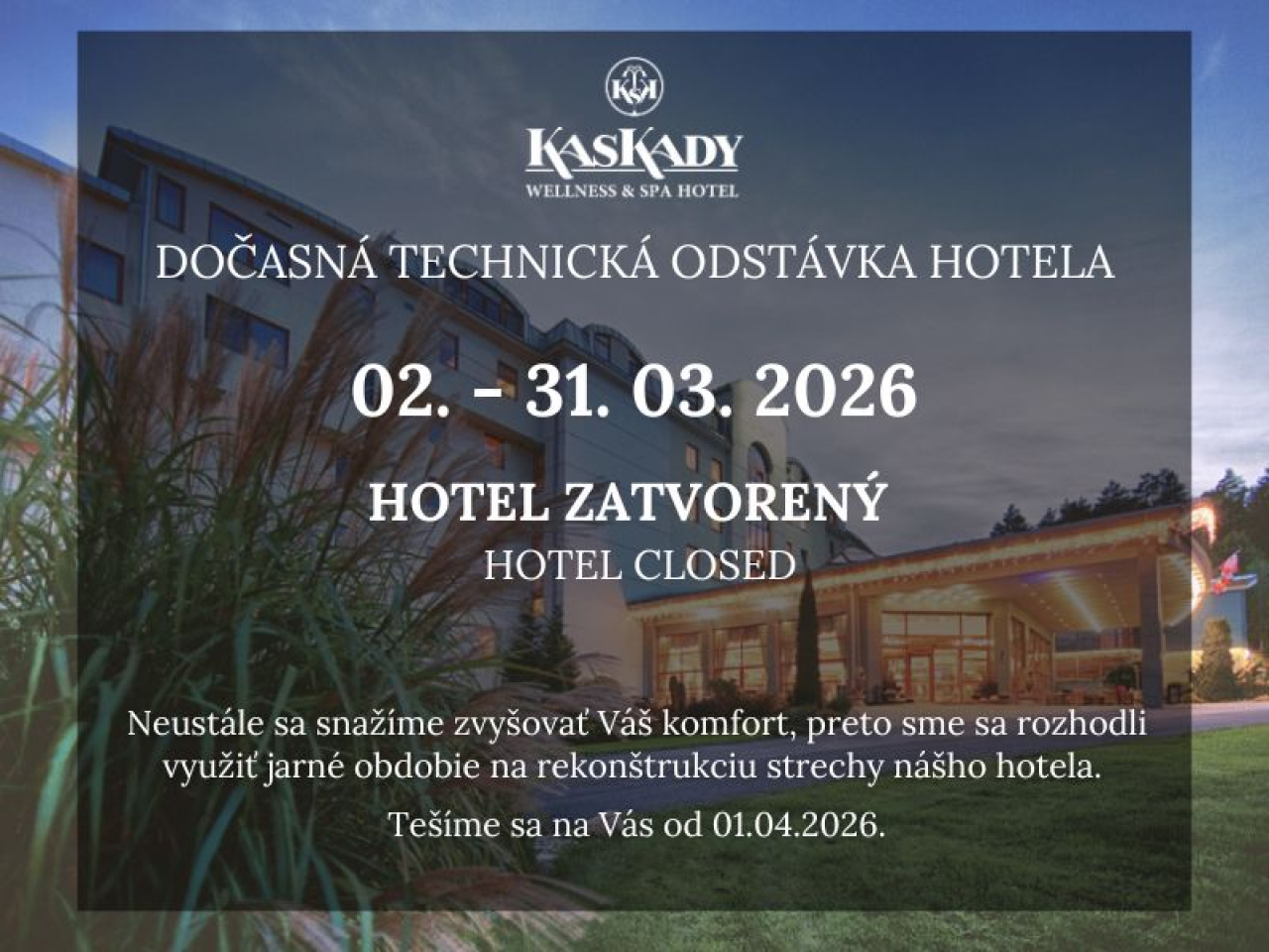 OBJEDÁVKA MASÁŽÍ A PROCEDÚR: Pre Vaše pohodlie Vám odporúčame objednať si wellness procedúry vopred, s časovým predstihom cez online rezervačný systém alebo priamo na wellness recepcii wellnessrecepcia@hotelkaskady.sk, 045/530 00 04 alebo 530 00 44.